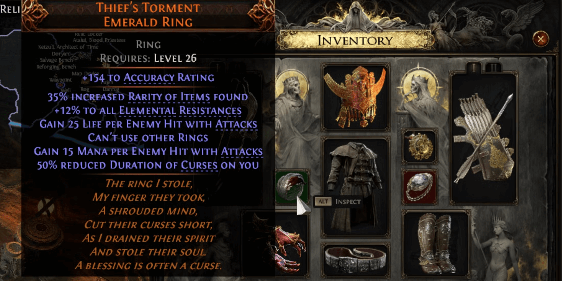 Thief’s Torment is a Unique ring that comes with a huge upside and a major tradeoff. It prevents the wearer from equipping another ring but compensates for this by granting strong sustain mechanics, including massive life and mana on hit.