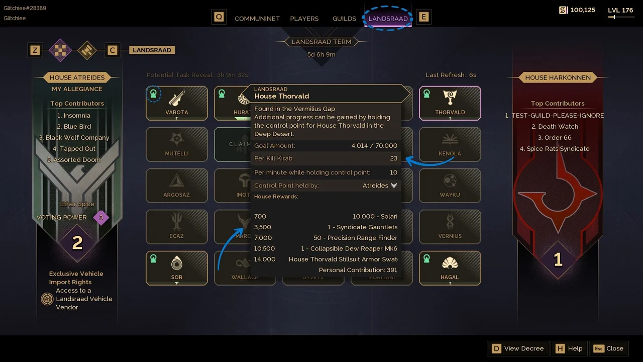 Each Tuesday at 3 PM PST, five House Representatives reveal tasks that your faction can complete. You’ll find these in the Landsraad tab of the Communinet.