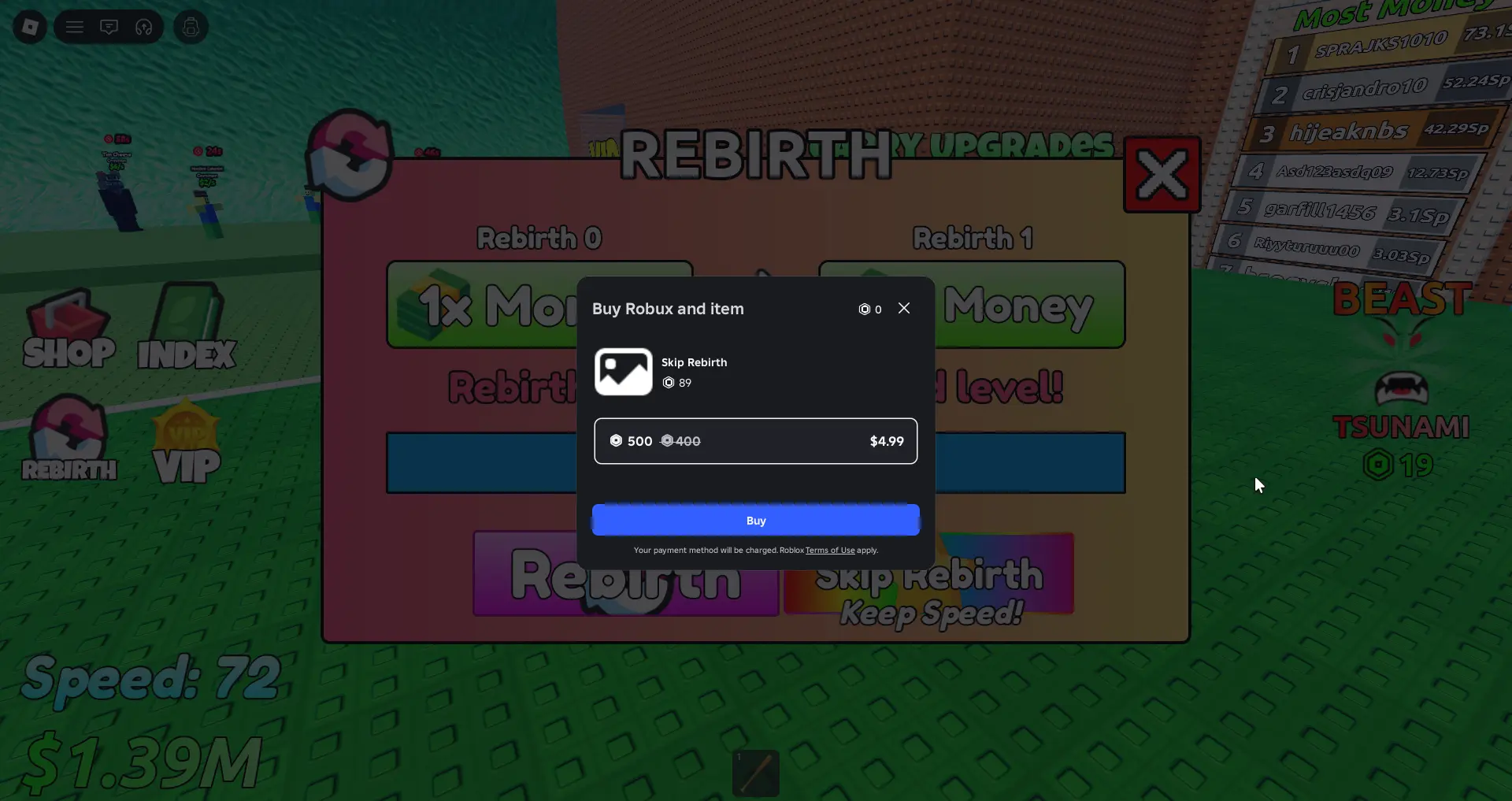 Rebirth in Escape Tsunami for Brainrots is gated by speed. You cannot rebirth unless you hit the required speed level for that rebirth tier.