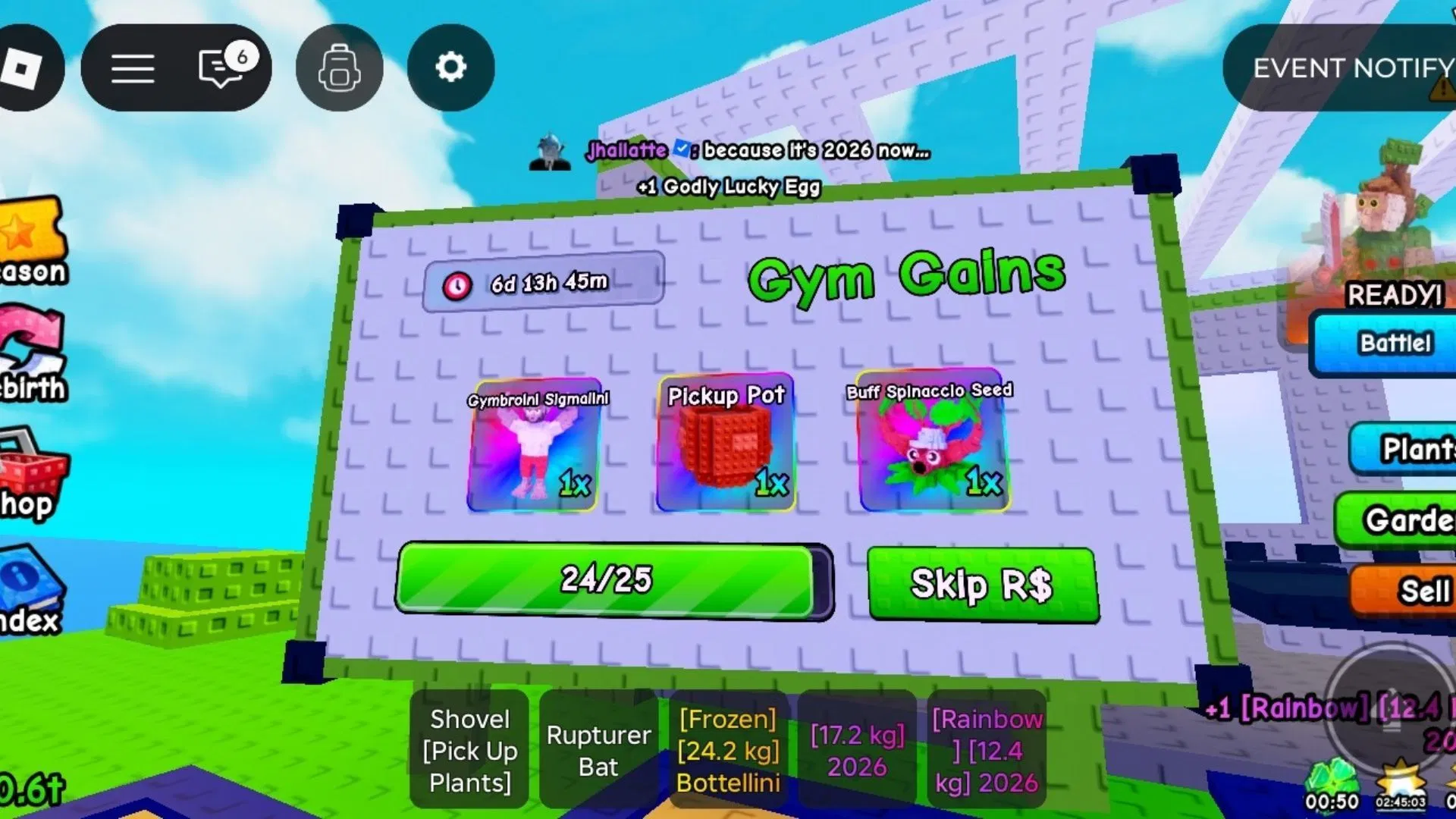 Good luck with the event, and may you unlock all the rewards in the Gym Gains Event as you level up your brainrots and plants!