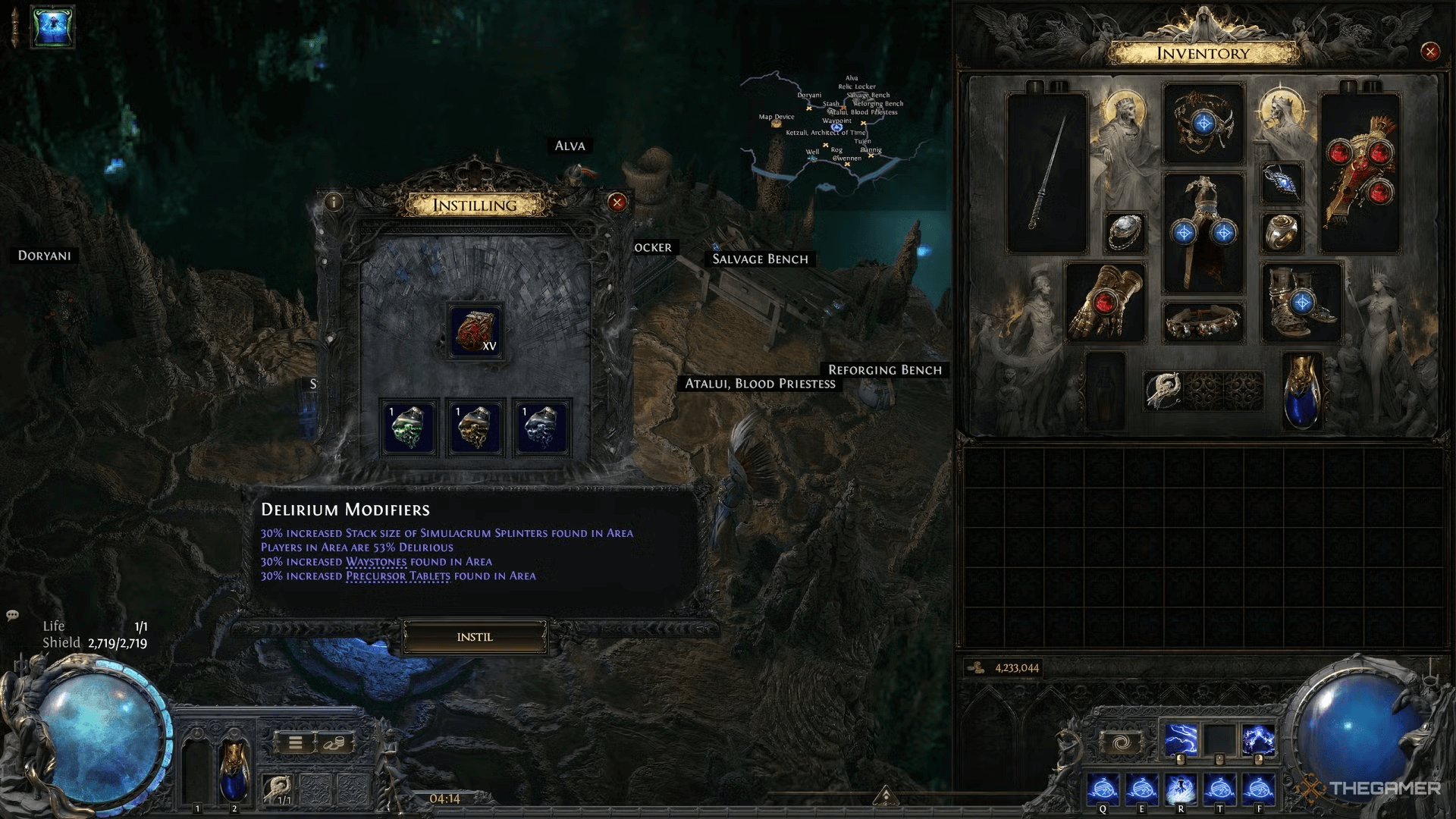 With your Distilled Emotions in hand, right-click one to open the anointing (instilling) window. This is where you’ll combine your materials to apply your Notable passive.