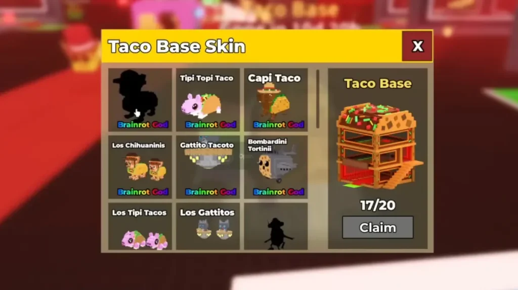 Below is a breakdown of Taco Brainrots you can use to unlock the Taco Base Skin. You only need 20 of these.
