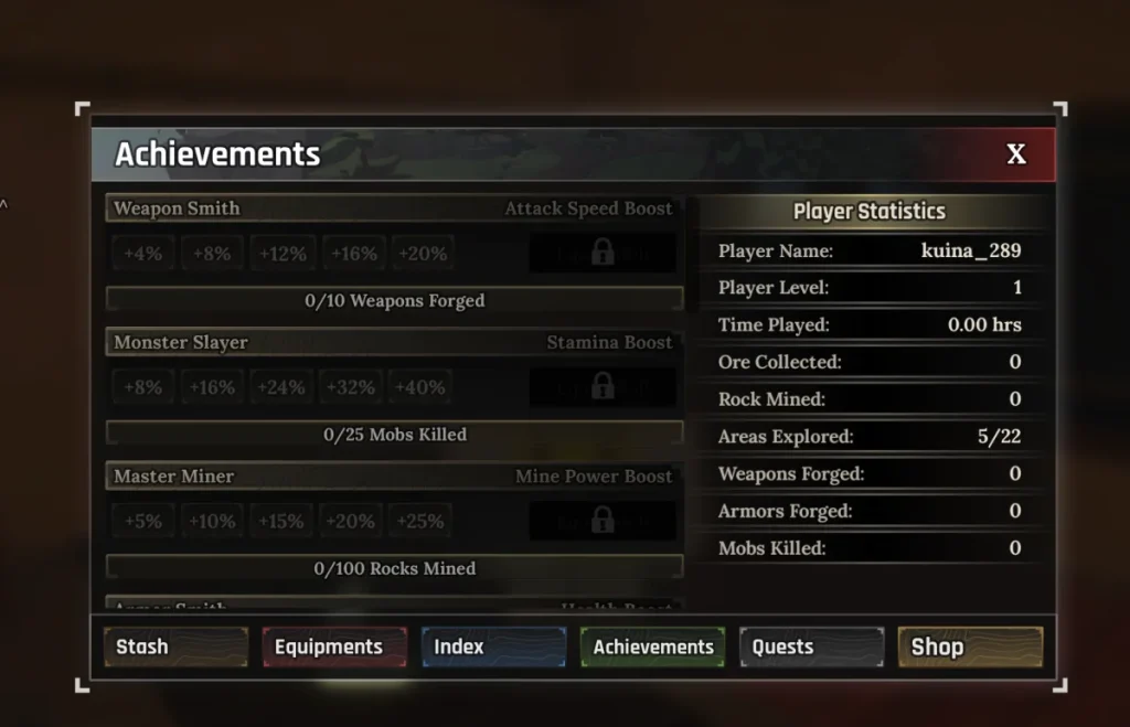 Weapon Smith progresses as you forge weapons. It is one of the earliest achievements that feels instantly useful because attack speed affects everything from clearing mobs to boss fights to triggering effects on weapon traits.